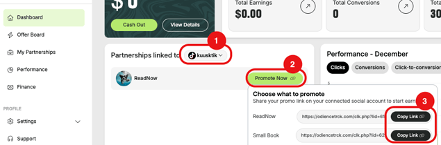 View from the Dashboard – select the social account that the promotion is tied to, then click to Promote Now and copy the offer link of the desired sub-offer.