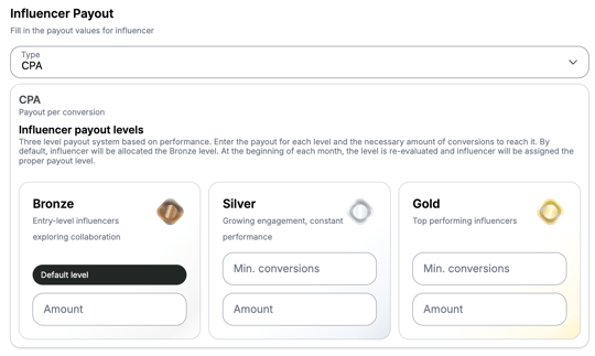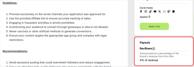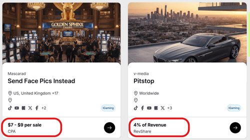 CPA, RevShare, and Hybrid (RevShare + CPA) payout models are available for influencers.