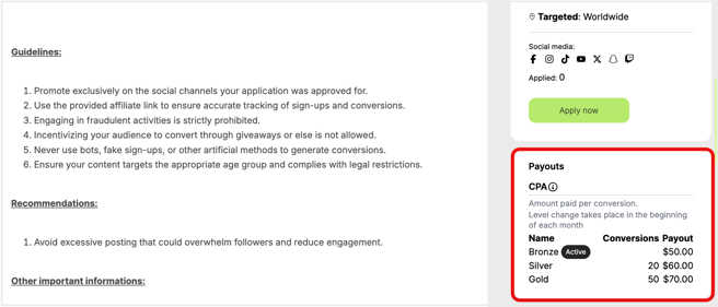 To see the payout details, go to the Offers tab > click the offer card and check the Payouts section on the right.