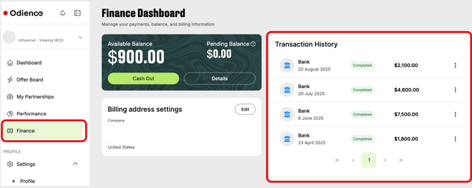 1. Go to the Finance tab in the sidebar menu > add your billing details, if you haven't done so > click the Cash Out button.