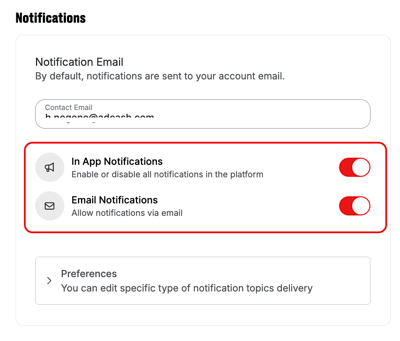 You may enable or disable ALL in-app and email notifications by toggling the switch on/off.