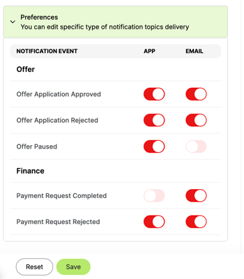 Notifications are grouped as Offer and Finance-related, as well as the receive point – app or email.