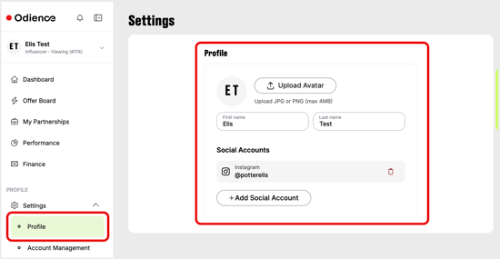 The profile section includes your full name, social media accounts, and a button to upload an avatar. All fields are editable.