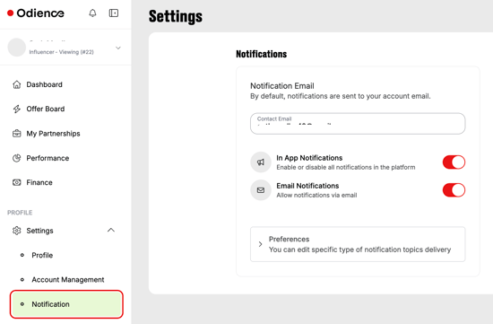 The Notifications page allows you to decide which in-app and email notifications you want to receive.