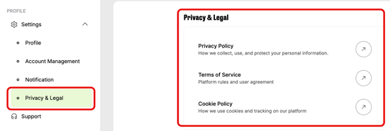 The Privacy & Legal page provides links to the Privacy Policy, Terms of Service, and Cookie Policy that are located on our website.